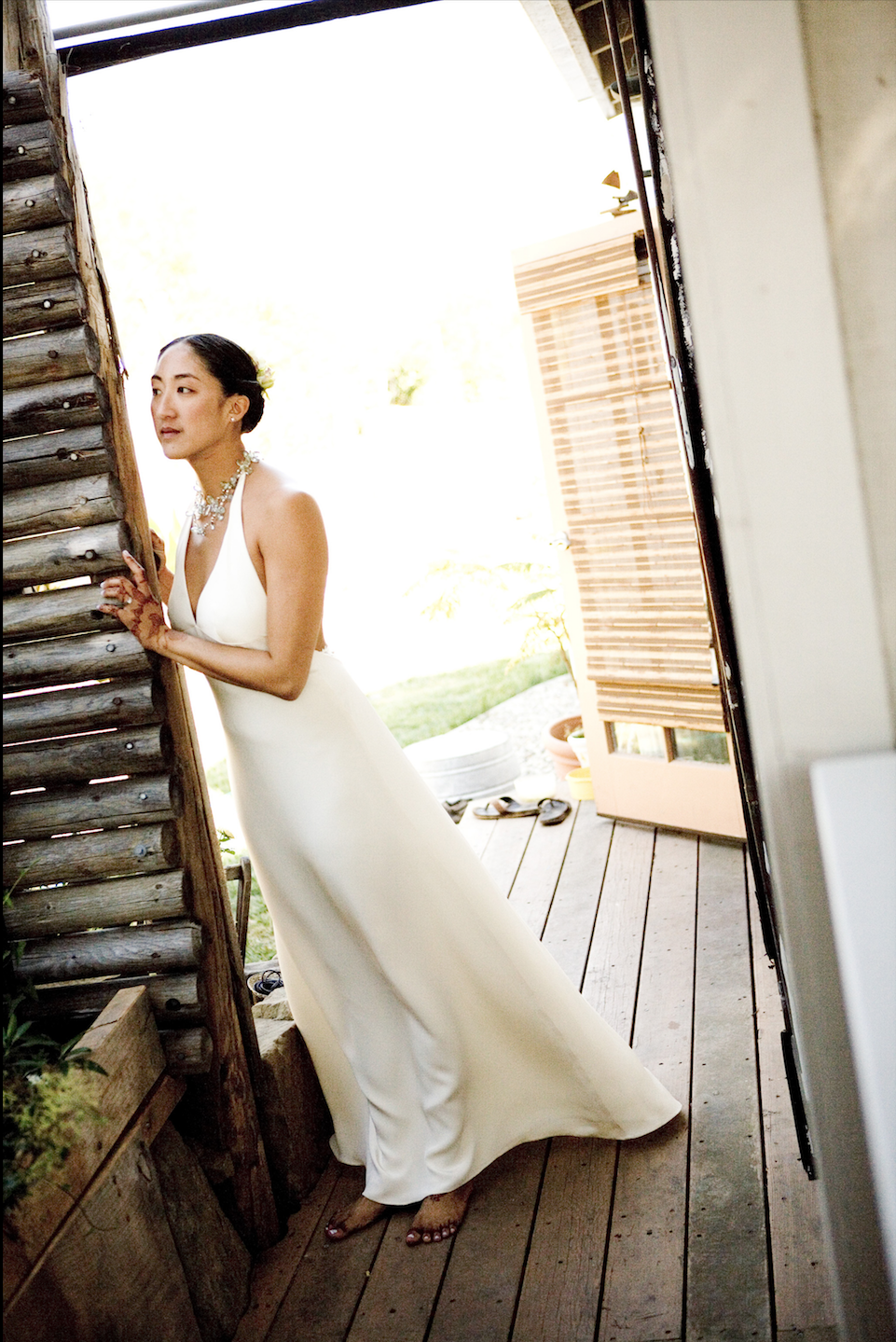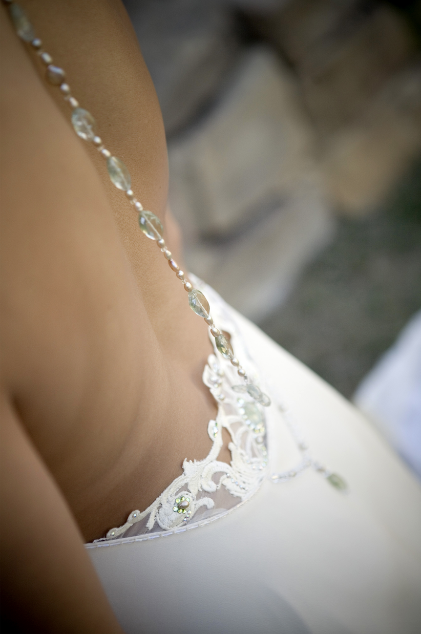 This is one of my favorite designs. It is a very simple, low-back, sheathe, halter-neck dress. However, we cut the back lower and added an embroidery design complete with Swarovski crystal and beadwork. Also, the bride asked her friend whom's a jeweler to craft her wedding jewelry to match the dress and its beadwork. I took some of the stones they used and incorporated them into the rest of the design. Dresses that contain a story and the brides own creativity are the best and most valuable kinds. They both carry and radiate the personality of the bride into the vows they take.
